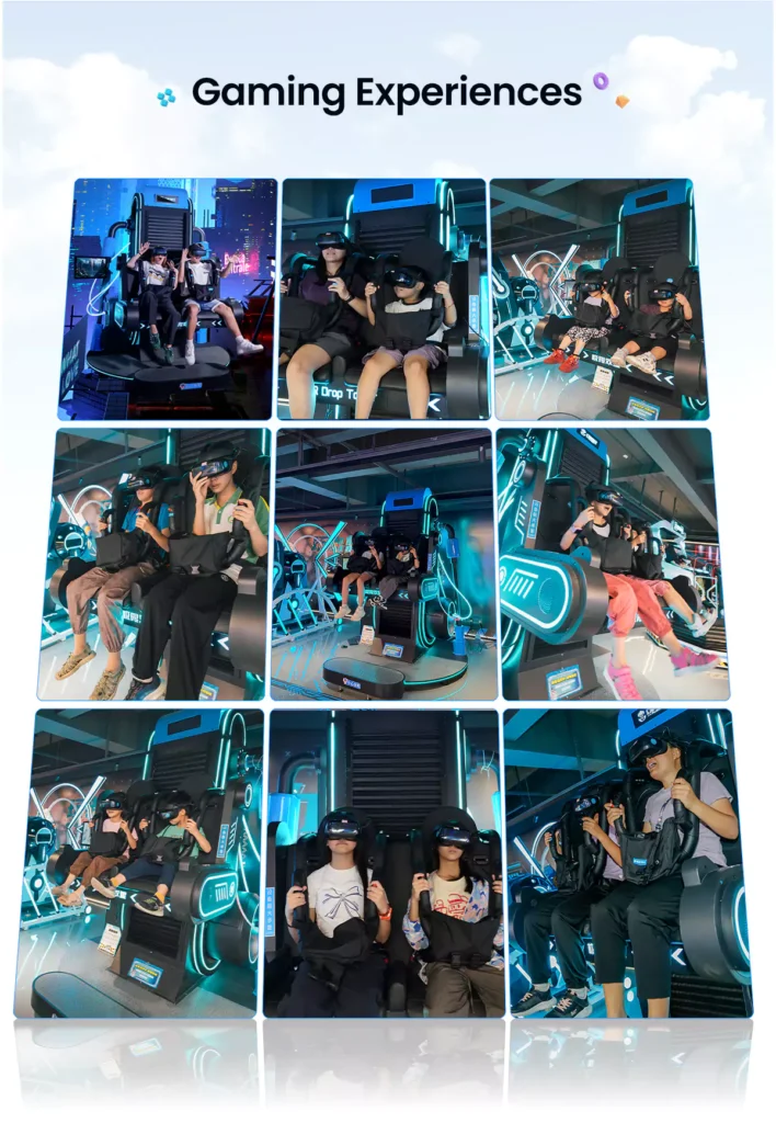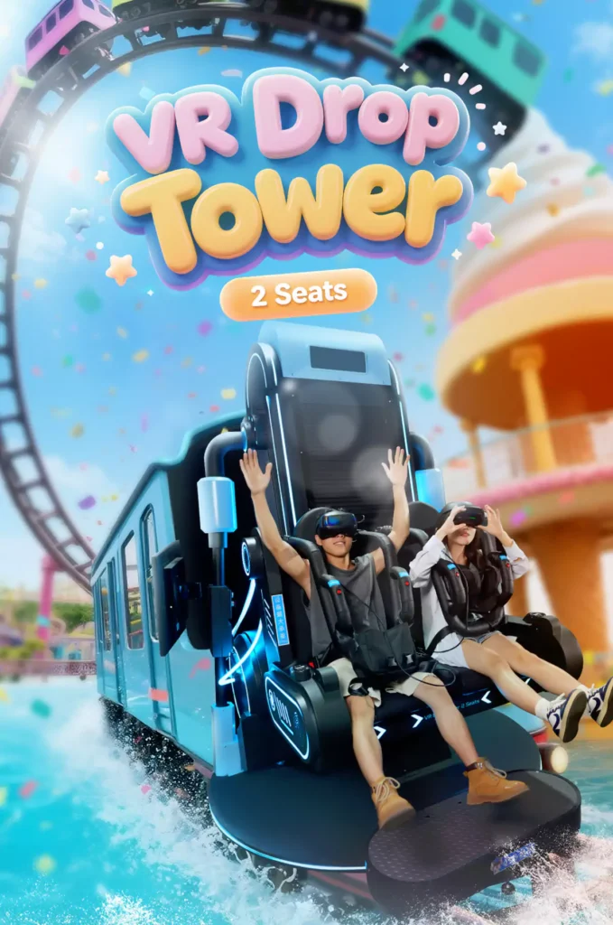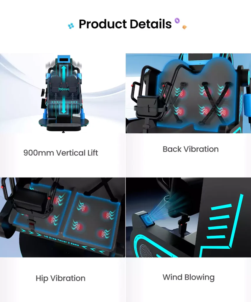 VR Drop Tower 2 Seats brings theme-park style drop tower thrills into an indoor vr cinema theater environment. The dynamic 9d vr machine platform, special effects and exciting VR content create a strong scream effect, making it a high-profit centerpiece for shopping malls, game centers and VR parks.