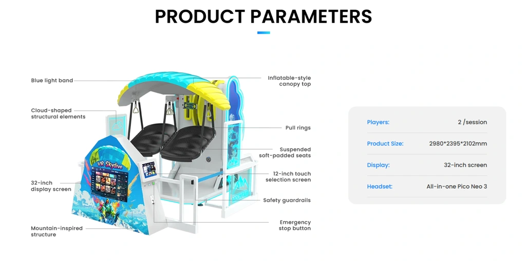 VR Skydive is a thrilling 9d virtual reality simulator that recreates the feeling of jumping from the sky, free-falling and gliding through clouds in a safe indoor environment. Working like an immersive vr flight Simulator, it combines VR visuals, motion effects and sound to attract adventure lovers in malls, FECs and VR parks, helping operators add a high-impact, high-return skydiving attraction with a compact footprint.